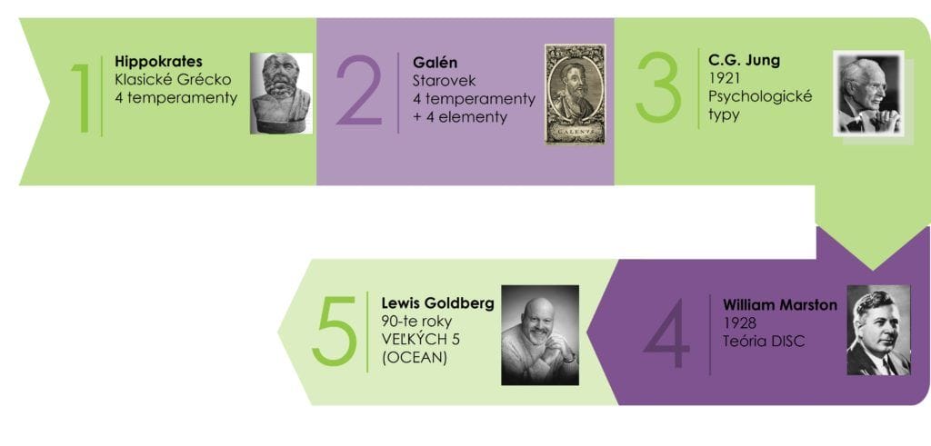 Pokud chceme sáhnout hlouběji do historie vývoje typologie, prazáklady bychom mohli hledat již v období klasického Řecka u Hippokrata v jeho teorii čtyř temperamentů, která dělí osobnosti na: